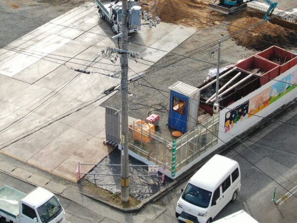 通常、この「仮囲い」は外から工事現場内が見えない素材を使うのが一般的ですが、この工事現場は道路から近く、通園のクルマの出入りもあるため、一部透明な部分を設けています。